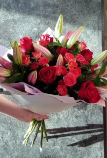 Этот великолепный букет состоит из изысканных кустовых роз и одноловых роз, совершенствующих свою красоту с солнечными лилиями. Изготовлен в мастерской манере, каждый цветок тщательно подобран для создания гармоничного сочетания. Букет представлен в шикарной, стильной упаковке, подчеркивающей его роскошь и благородство. Это произведение флористического искусства станет исключительным подарком, достойным самых особенных моментов.